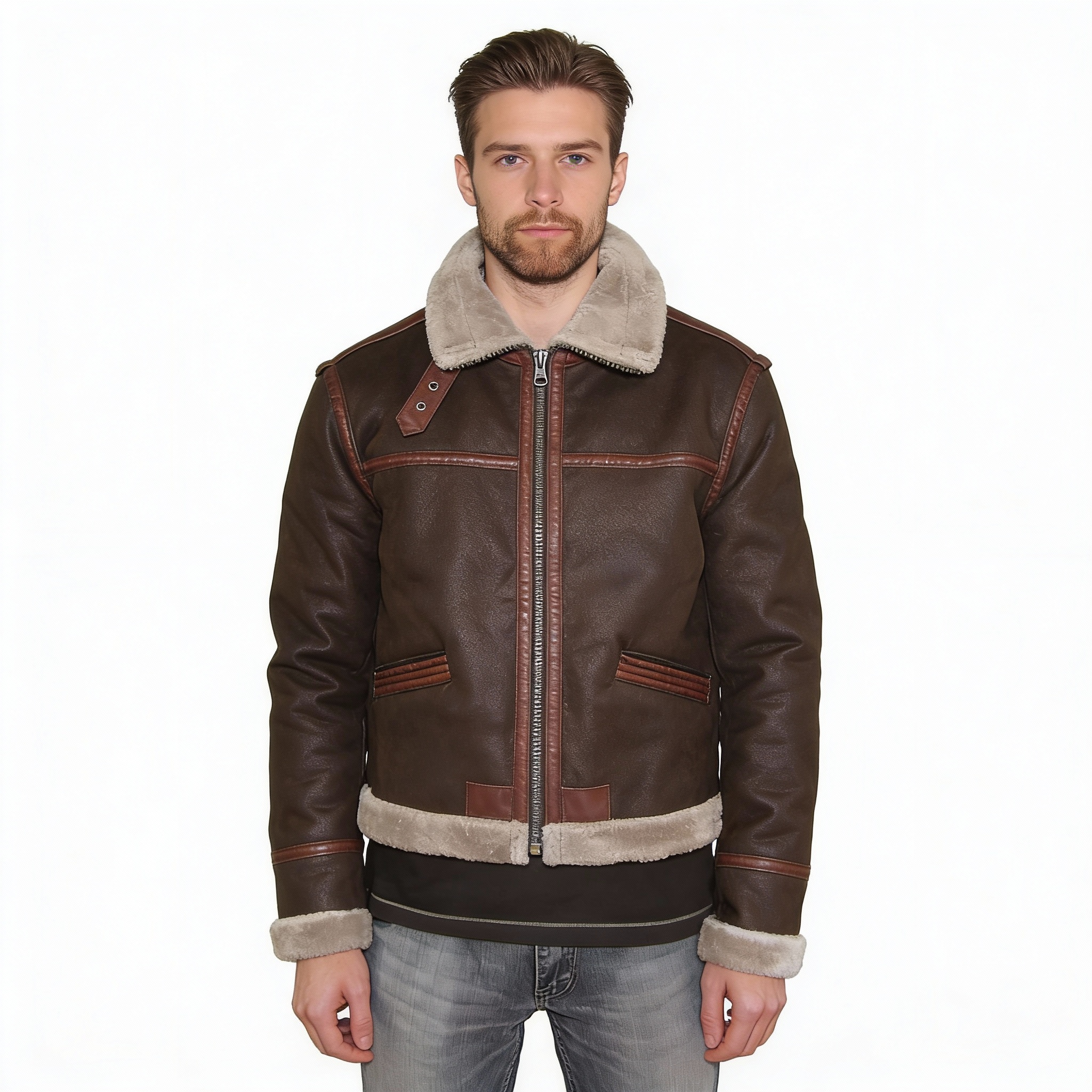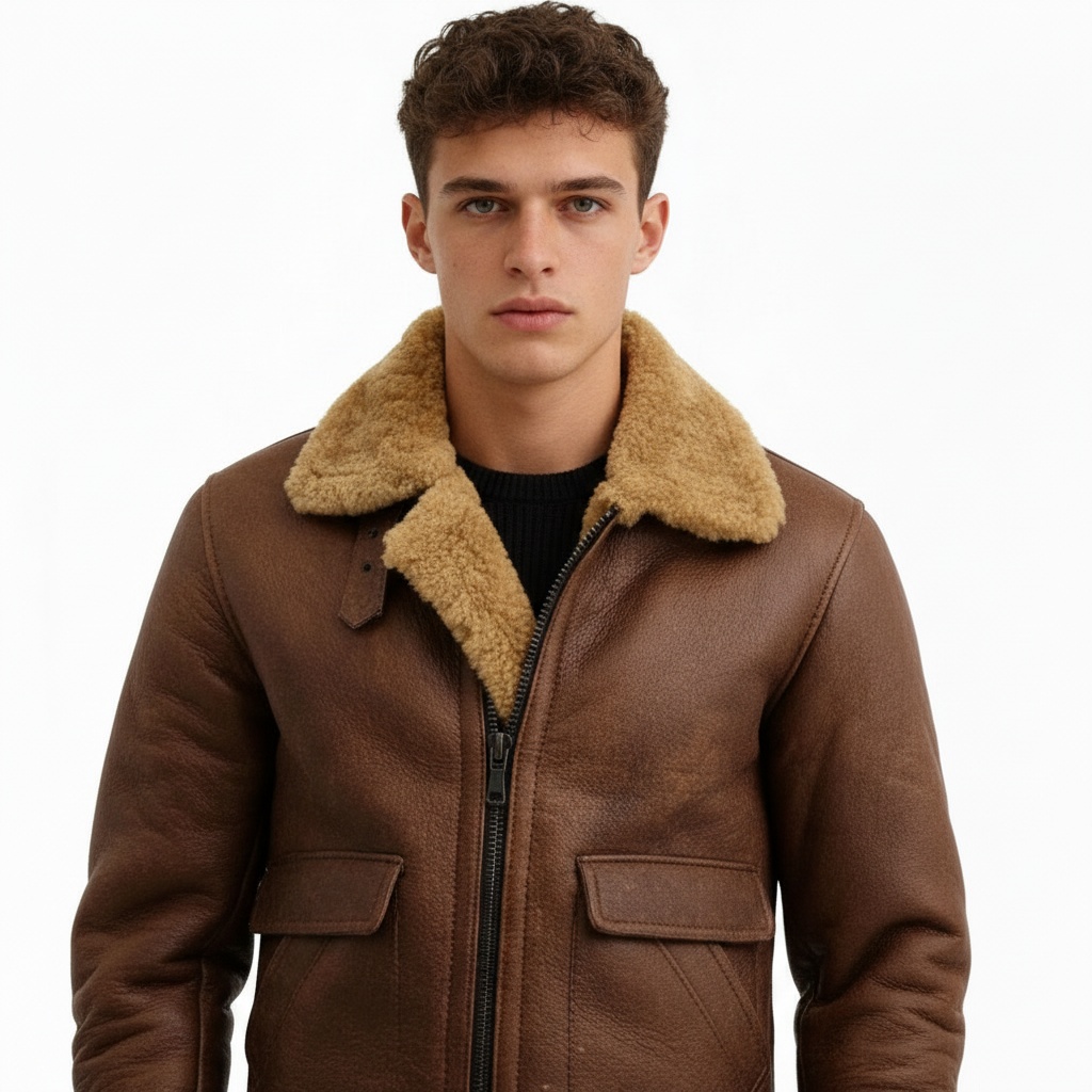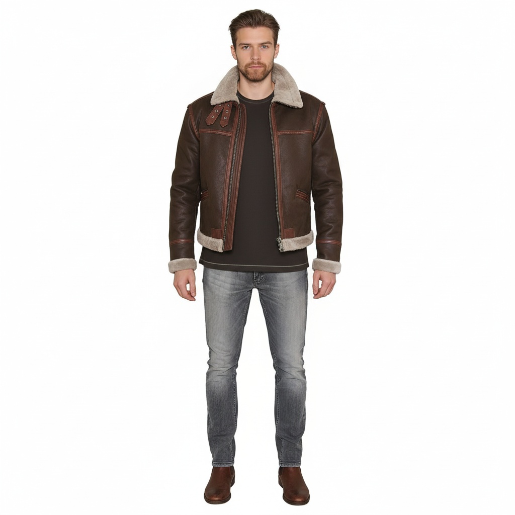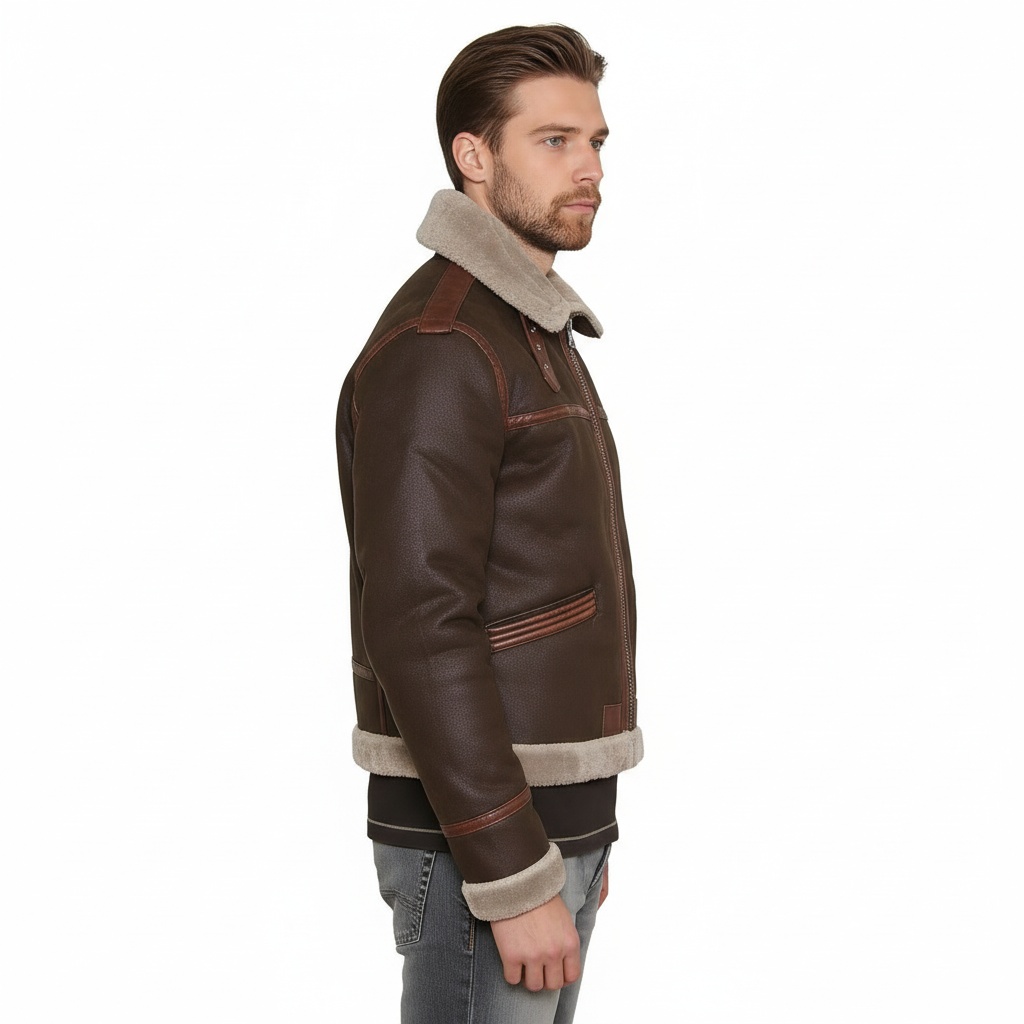 This is a dark brown aviator jacket for men, which has a contemporary interpretation of the classic bomber. This jacket is designed to be durable and warm with the help of its individual contrast leather paneling and a warm, plush, greyish-beige shearling collar. The dark brown shade of the product is sleek, and therefore it is a timeless winter accessory in the USA market.