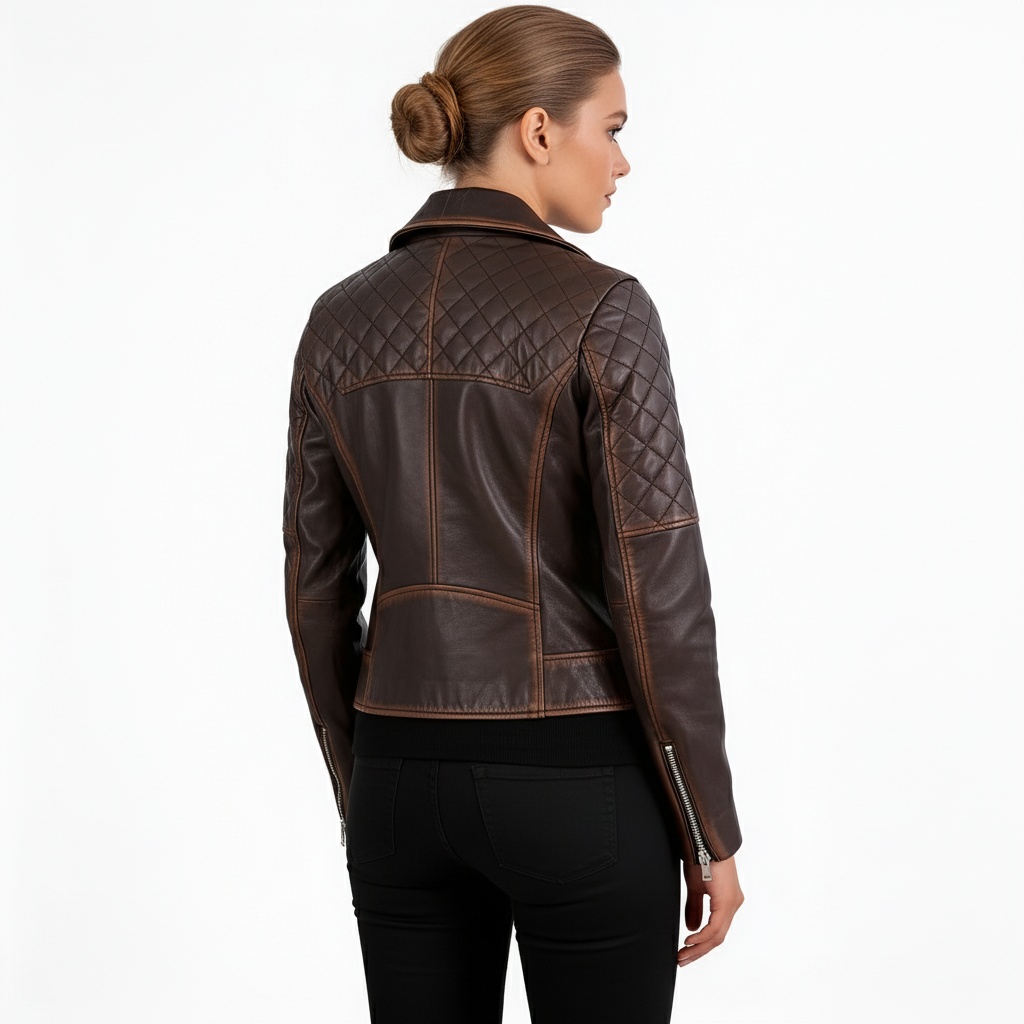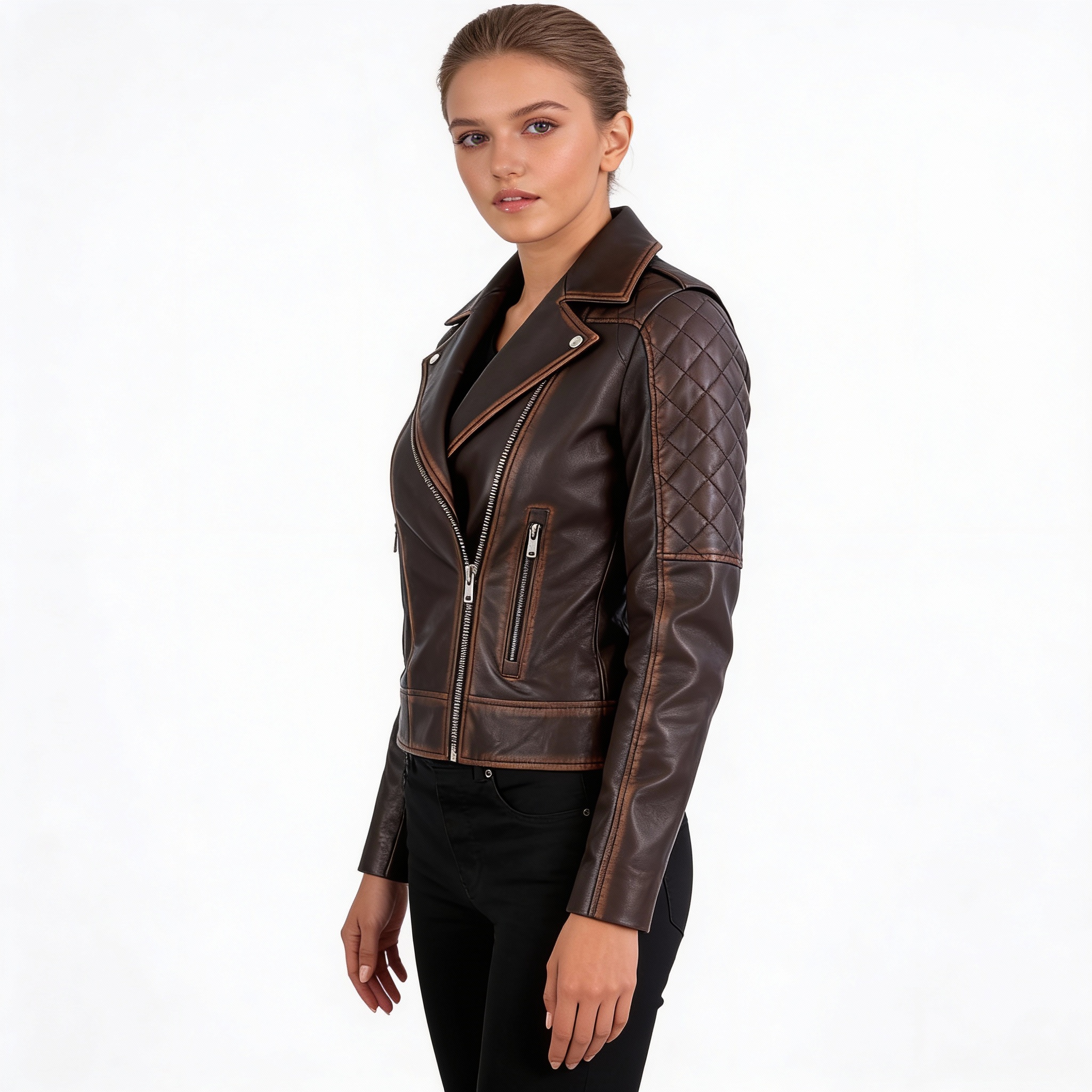 Bring some wild sophistication to your outfit with our VINTAGE Women’s Biker Jacket, Distressed, Brown Leather. This is a well-polished composition with a distinct burnished touch that makes it look like an old, worn, and used work of art. Created to appeal to the contemporary woman in the USA who adores a combination of the moto-style and elegant detailing.